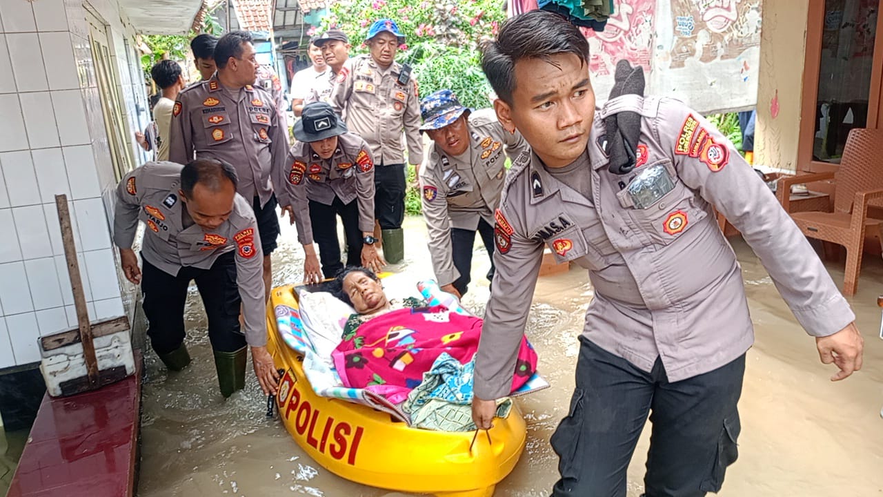 Selain melakukan pemantauan kondisi genangan, petugas juga melaksanakan langkah kemanusiaan dengan mengevakuasi seorang warga yang sedang sakit menggunakan perahu kano milik Sat Samapta, sebagai bentuk respons cepat terhadap kondisi darurat di tengah genangan air.