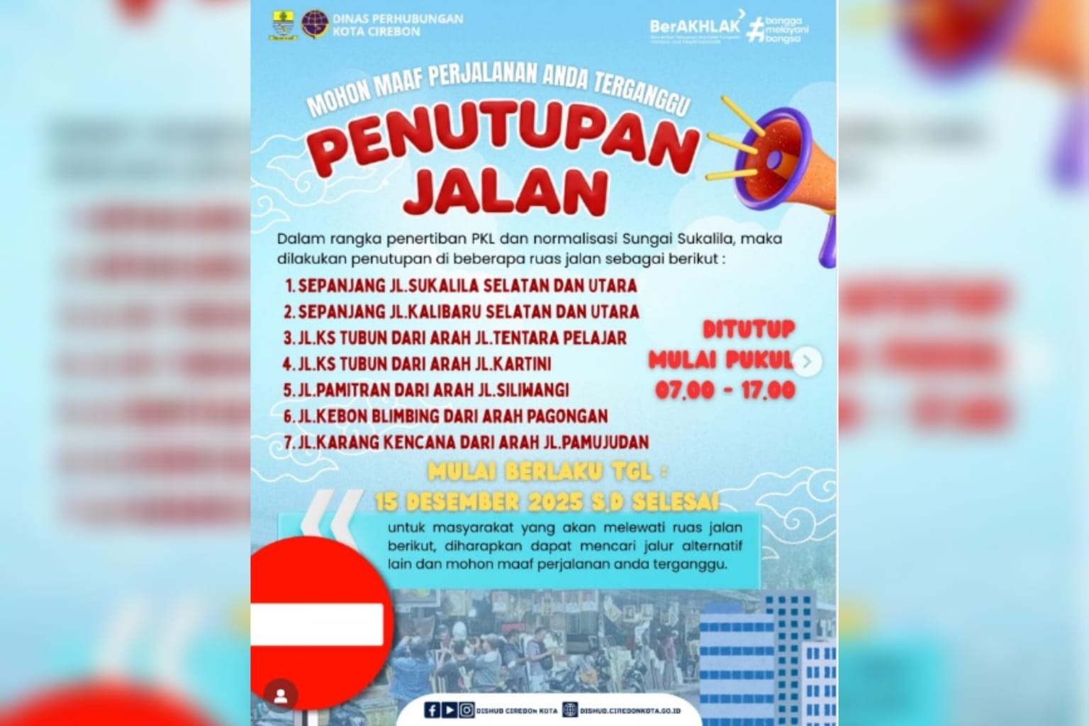CIREBON, CirebonUpdate.id – Pemerintah Kota (Pemkot) Cirebon akan melakukan penutupan dan pengalihan arus lalu lintas selama kegiatan penertiban dan pembongkaran lapak Pedagang Kaki Lima (PKL) di sempadan Sungai Sukalila dan Kalibaru, Senin (15/12/2025).